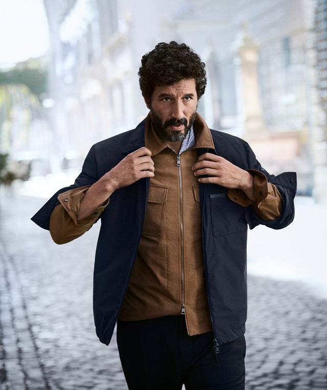 Person wearing a beige jacket, denim shirt, and wide-leg jeans by Loewe